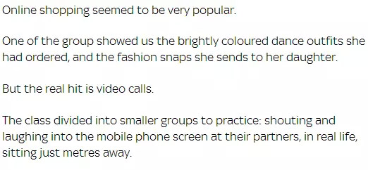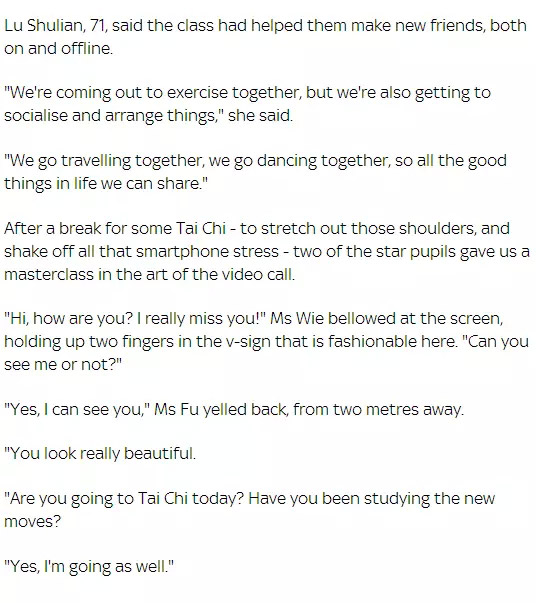 "Say I want to get in touch with big sister over there," she explained, "to see whether she is going to Tai Chi, I just get out WeChat and make a video call with her.