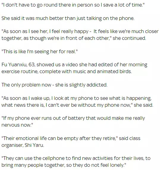 “他们退休后的情感生活可能会很空虚”组织者史娅如说道,“他们可以使用手机为自己的生活寻找新的活动,把许多人聚在一起,这样他们不感到孤单”。